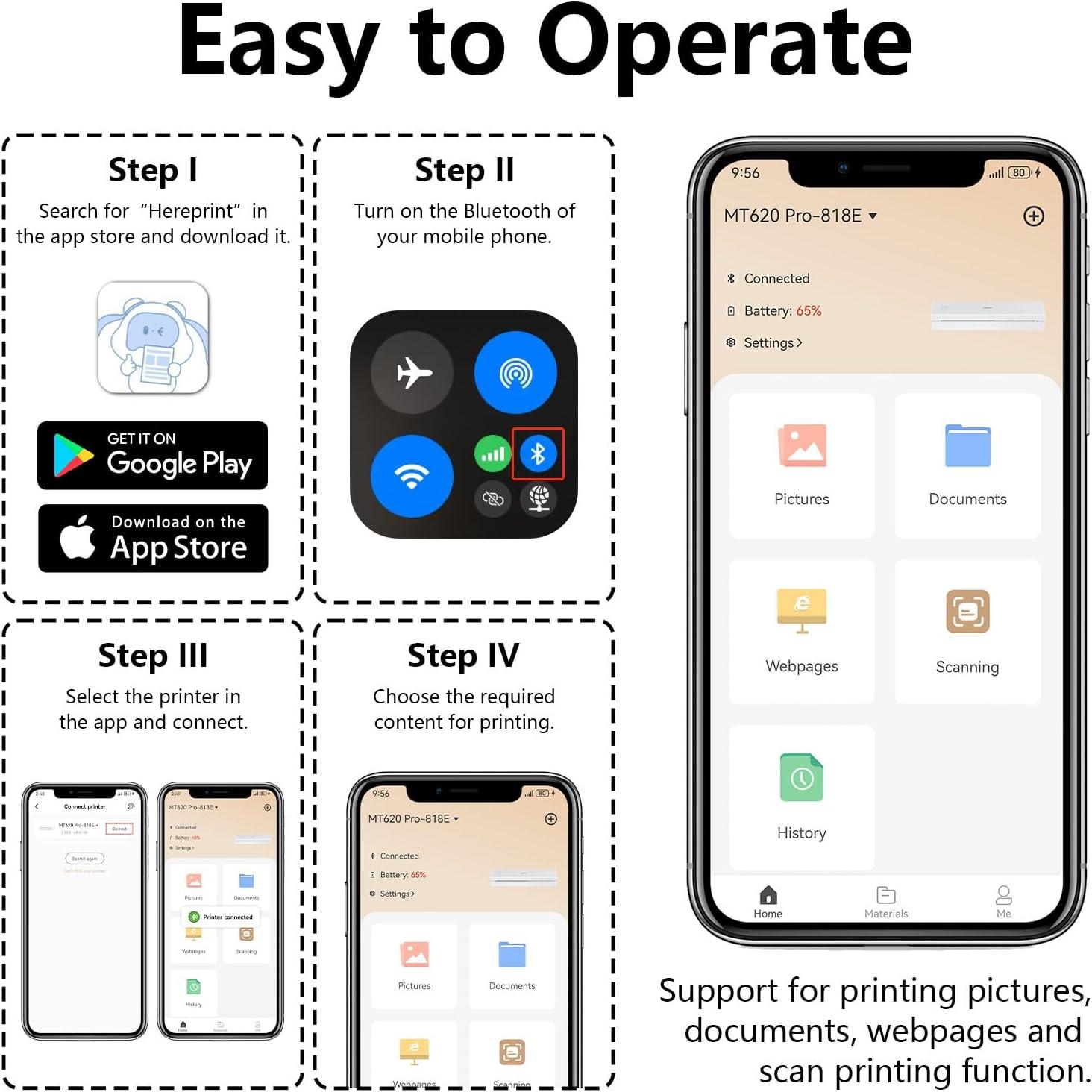 HPRT MT620 Portable Thermal Printer - Inkless Printer, Supports Regular Paper & Labels, Multi-User Bluetooth & Auto Paper Feed (Pro Black Printer+10Sheets)(MT620 Black 300dpi+10Sheets)