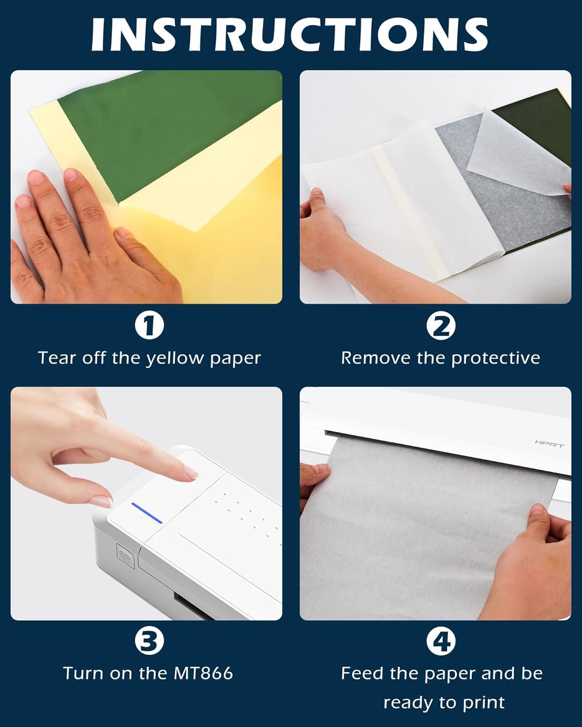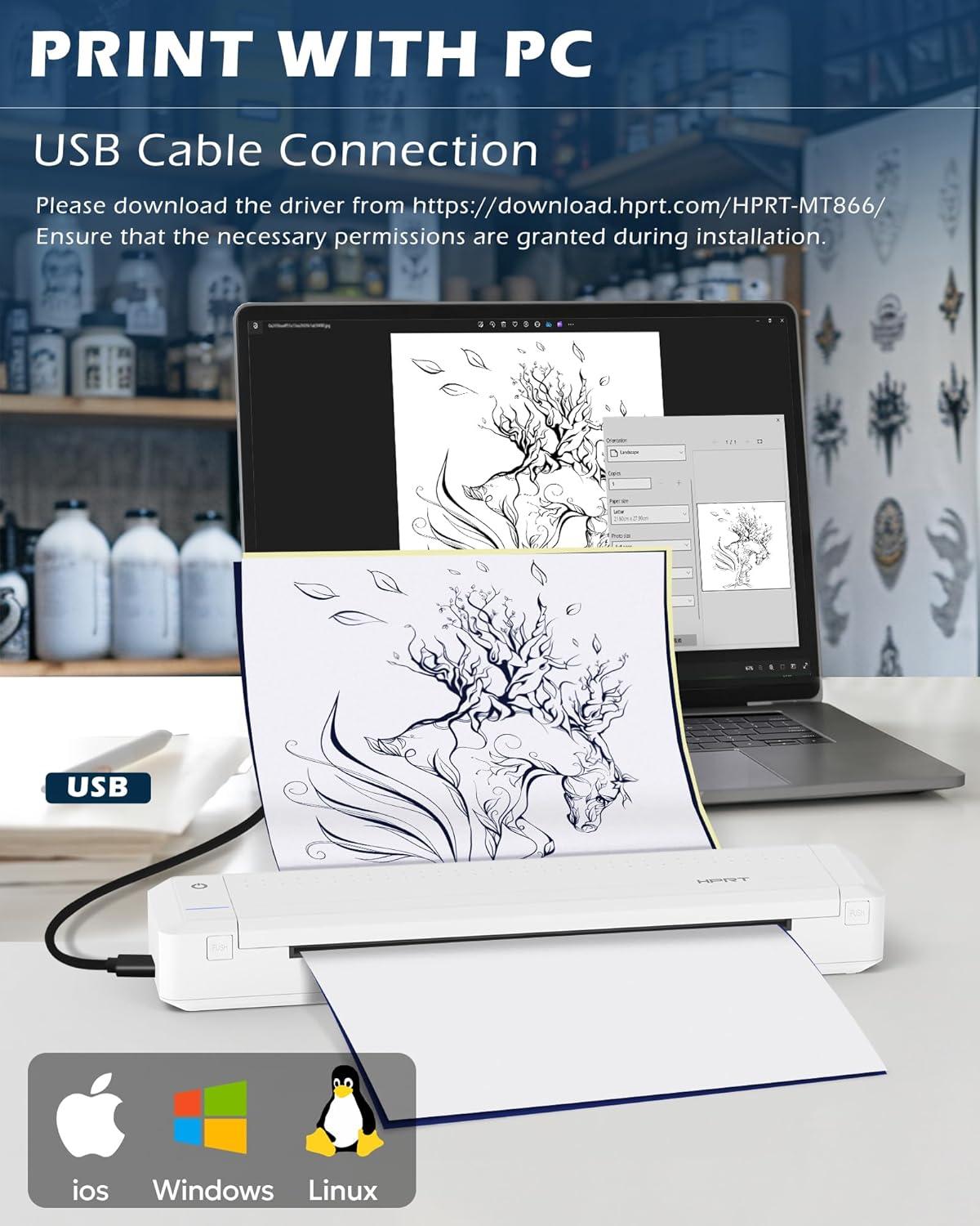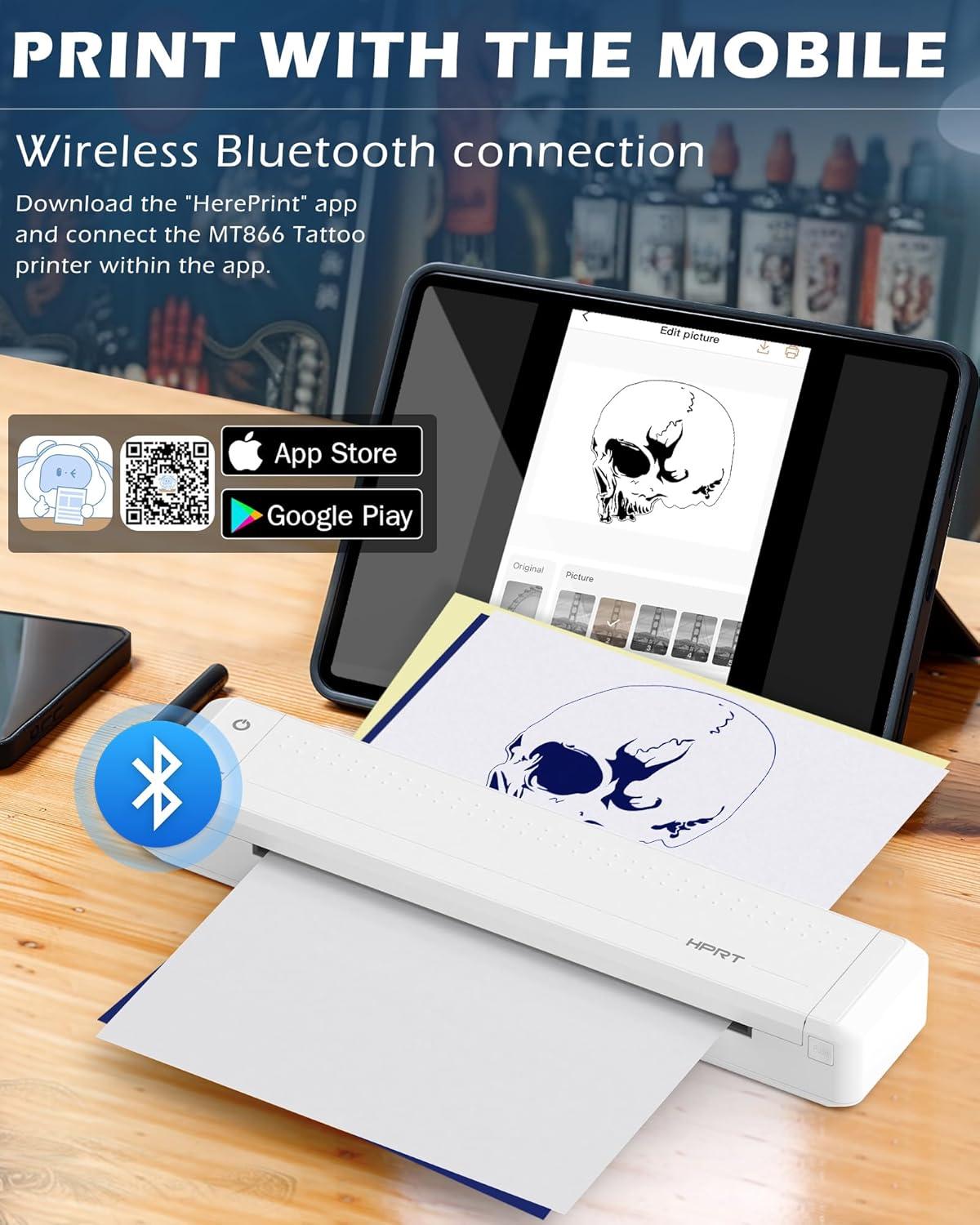 HPRT MT866 Thermal Tattoo Stencil Printer Kit - Wireless Bluetooth connectivity, Compatible with Smartphones, Tablets, Laptops, Perfect for Tattoo Artists and Beginners, includes 110pcs Transfer Paper
