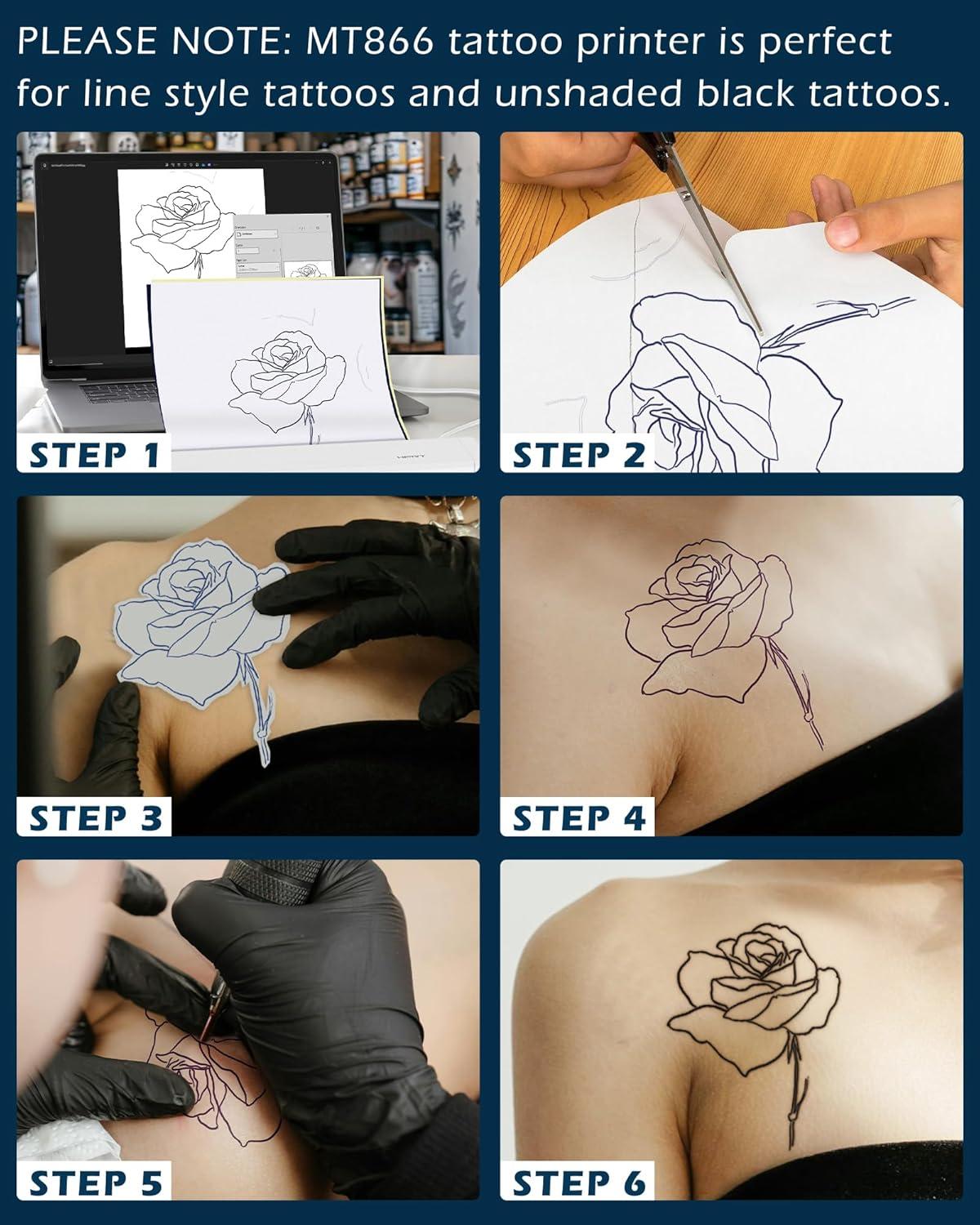 INTUITIVE & USER-FRIENDLY DESIGN: Designed for simplicity, HPRT MT866 tattoo printer is perfect for both beginners and professionals. You can operate directly from the HerePrint app with ease. The user-friendly interface ensures that the setup and printing process are straightforward, allowing you to focus on your creativity. We also offer 10 free transfer papers to help you start your tattoo journey effortlessly.