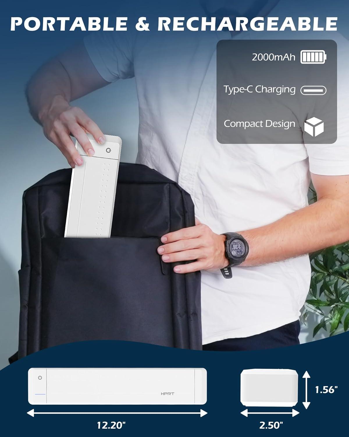 TATTOO STUDIO ON THE GO: Measuring just 12.20 x 2.50 x 1.56 inches, HPRT MT866 is designed for mobile tattoo artists. Its compact profile fits easily into your bag, making it ideal for on-the-go sessions. With the built-in 2000mAh battery, you can print up to 70 sheets on a single charge and recharge conveniently via the type-C port on the side.